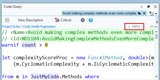 More than 150 default code rules are proposed to check against best practices. Support for Code Query over LINQ (CQLinq) to easily write custom rules and query code. CQLinq is used both to write the rule code, and also to write smart C# formulas that estimate the **Technical-Debt for each issue** (i.e the cost-to-fix an issue).